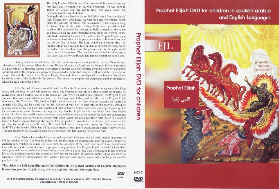 Description: This children's DVD contains a half hour film which tells the story of Prophet Elijah's miraculous and heroic life. The video tells the story through short cartoon episodes and through the use of several beautiful icons. This recording is sure to inspire your children towards a holier life. It can be played in either the English or Arabic languages. The DVD also contains a short segment explaining Prophet Elijah's icon and also excellent Arabic and English recordings of his Troparion.
